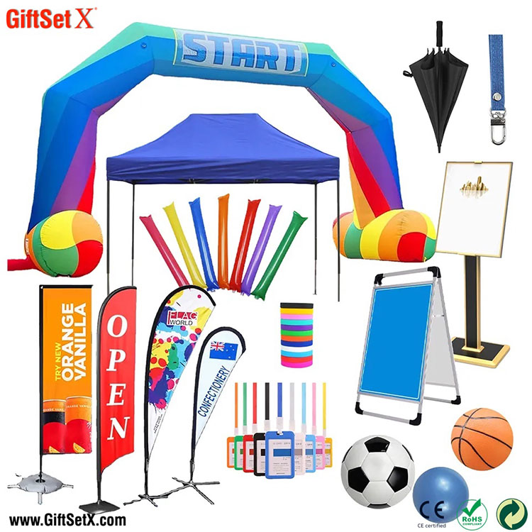 উপহার সেট, প্রদর্শনী তাঁবু, ইজেল, সাইনেজ, ইনফ্ল্যাটেবল খিলান, ন্যস্ত, ব্যানার, সাপোর্ট স্টিক, কাজের চিহ্ন, বল, ফ্যান, চার্জ তার, প্রদর্শন তাক, ব্রেসলেট, জলের মগ, কার্ড ধারক, প্রদর্শন স্ট্যান্ড এবং আরও অনেক কিছু। সমস্ত GiftSetX বিজ্ঞাপন উপহার সেট কাস্টমাইজ করা লোগো মুদ্রণ এবং গ্রাহকের বিশেষ অনুসন্ধান অনুযায়ী একটি বিশেষ সেটে একত্রিত করা যেতে পারে।